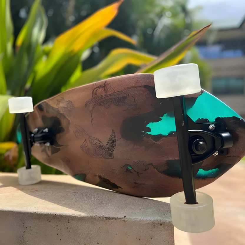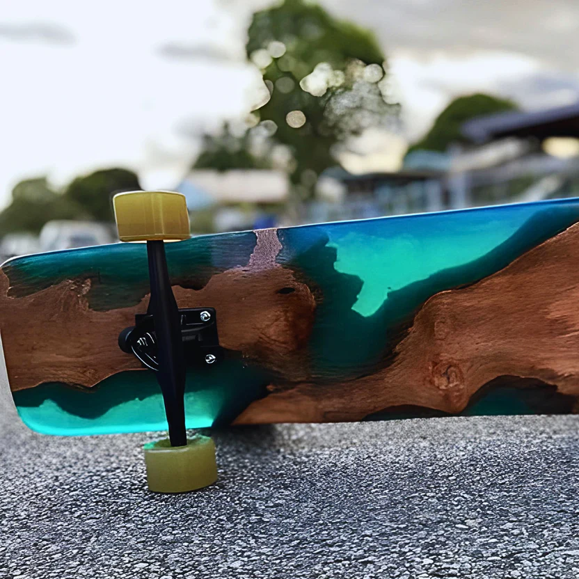 With its sleek design and premium construction, the Wood & Epoxy Resin Skateboard is perfect for riders who appreciate style and performance. Whether cruising down the street or hitting the skate park, this skateboard will turn heads and make a statement.